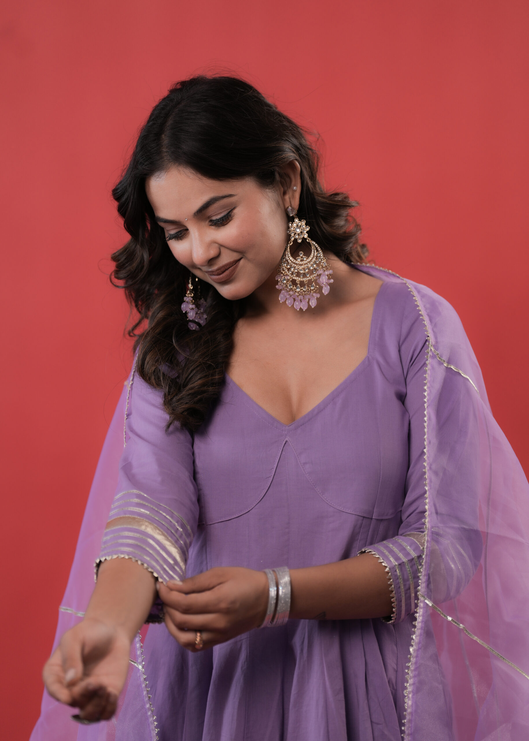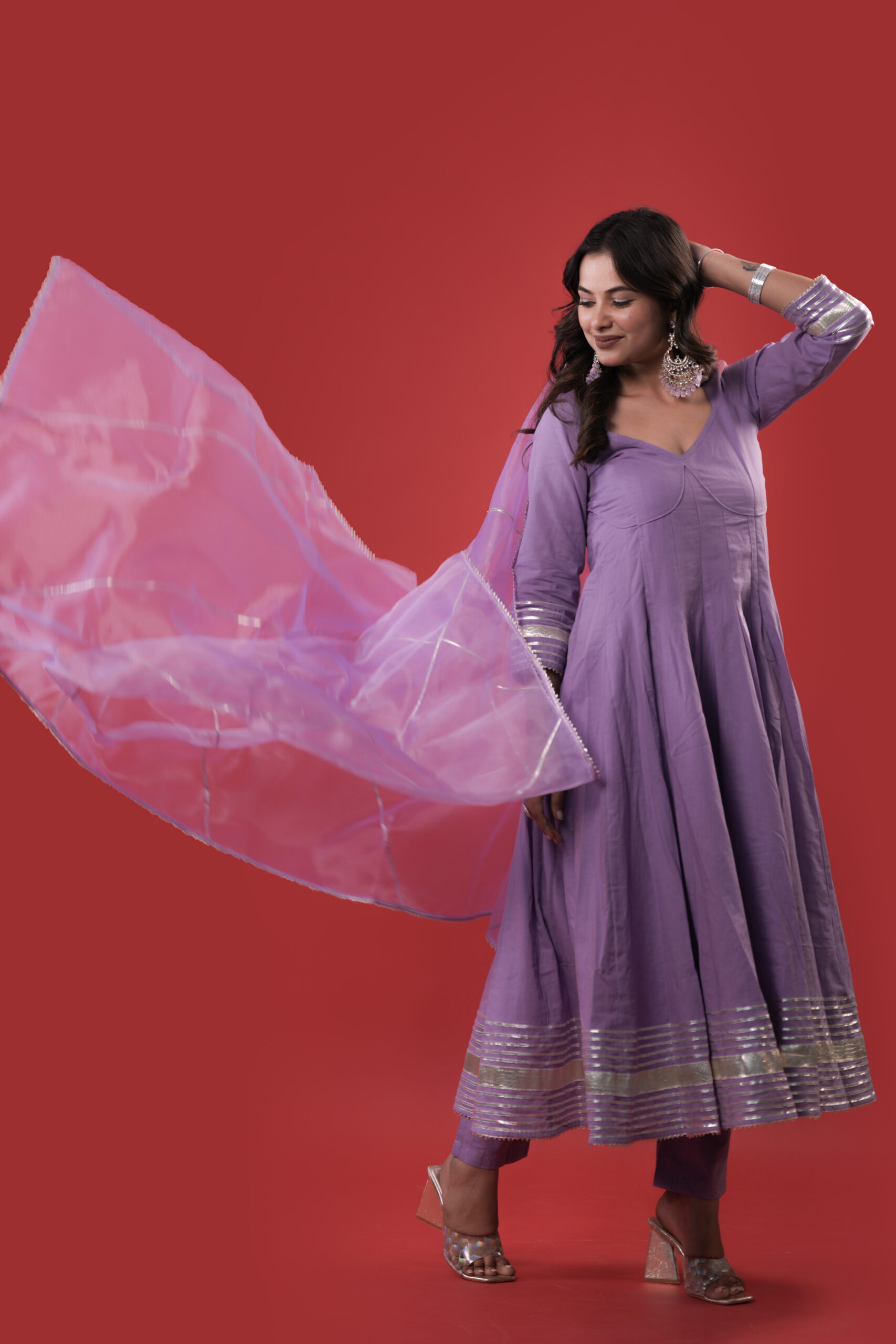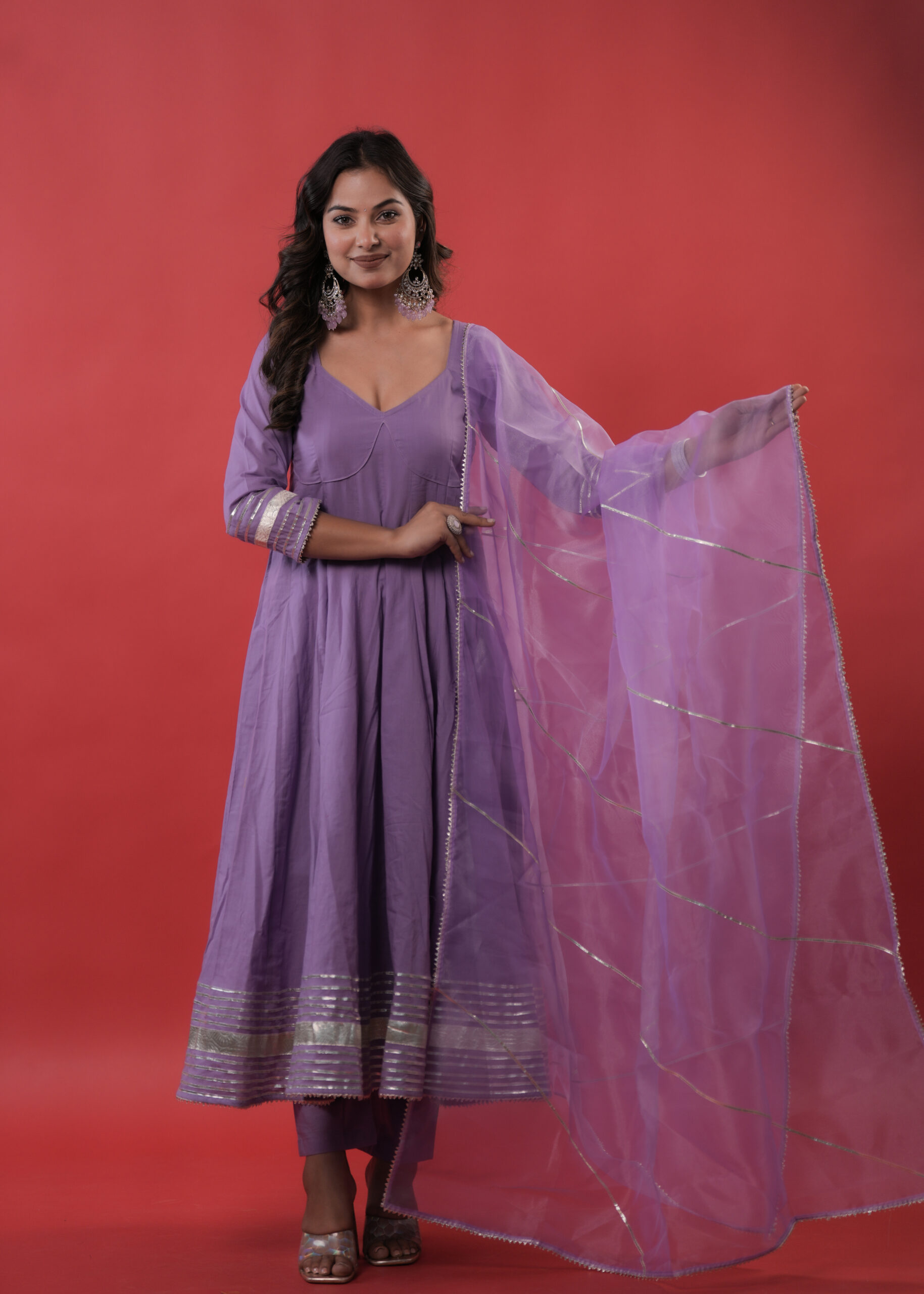 Drape yourself in regal elegance with this lilac Lavender Anarkali suit set , featuring a majestic flared silhouette enriched with shimmering silver gota and lappa detailing on the sleeves and hemline. The graceful V-neckline adds a refined charm, while the sheer dupatta accented with delicate silver gota lines completes the royal look. An exquisite choice for weddings, festive soirées, and grand celebrations.