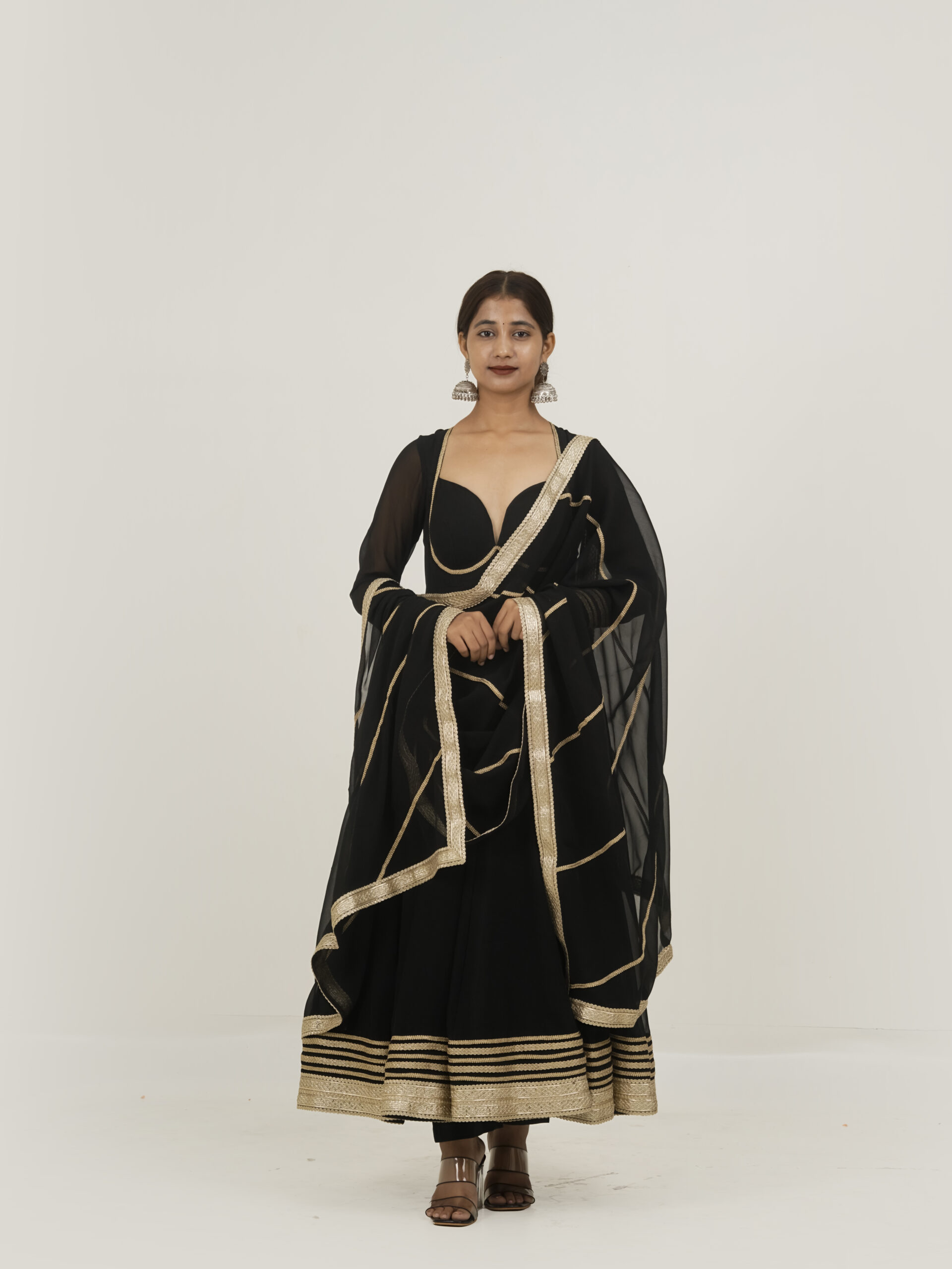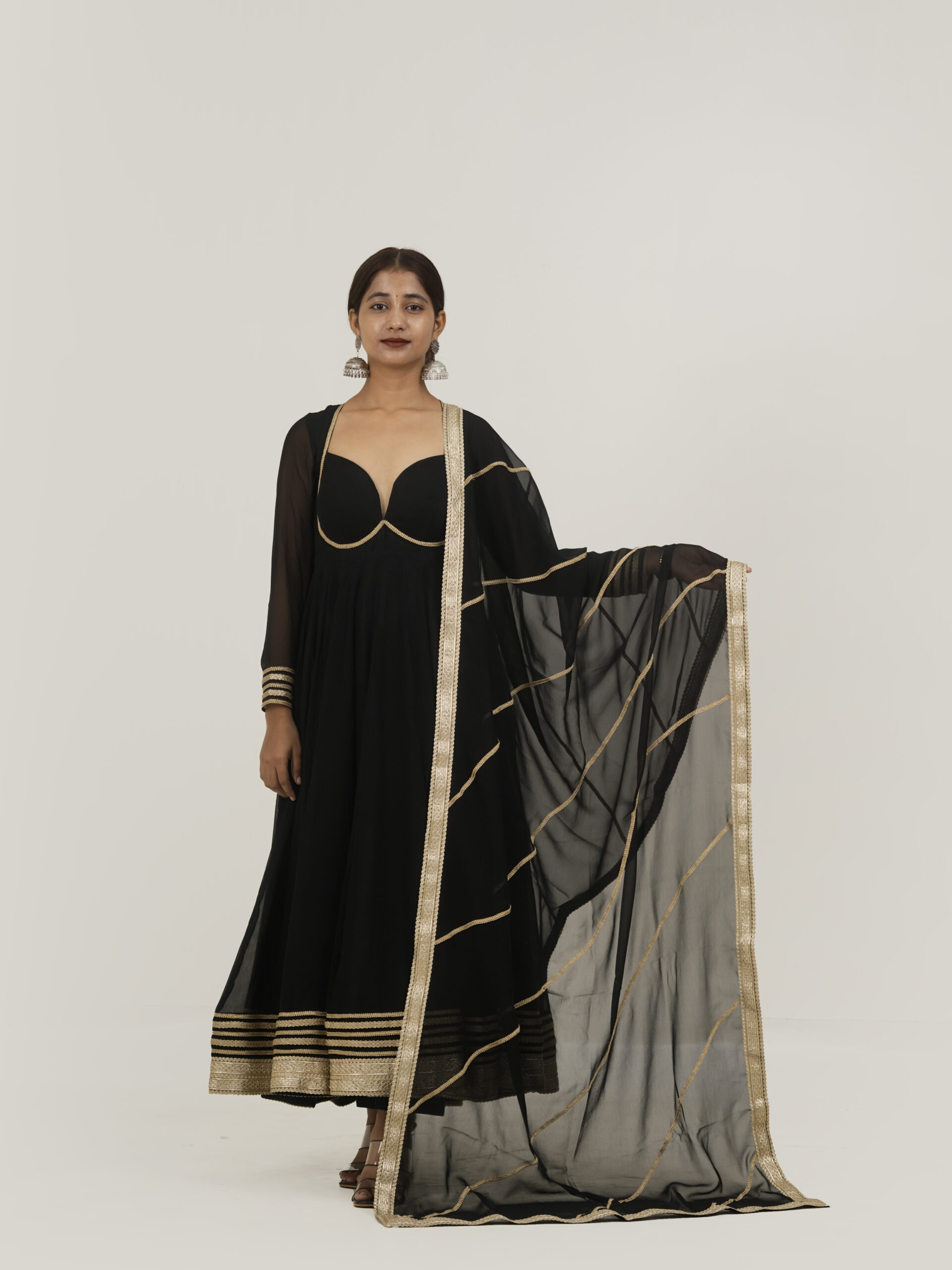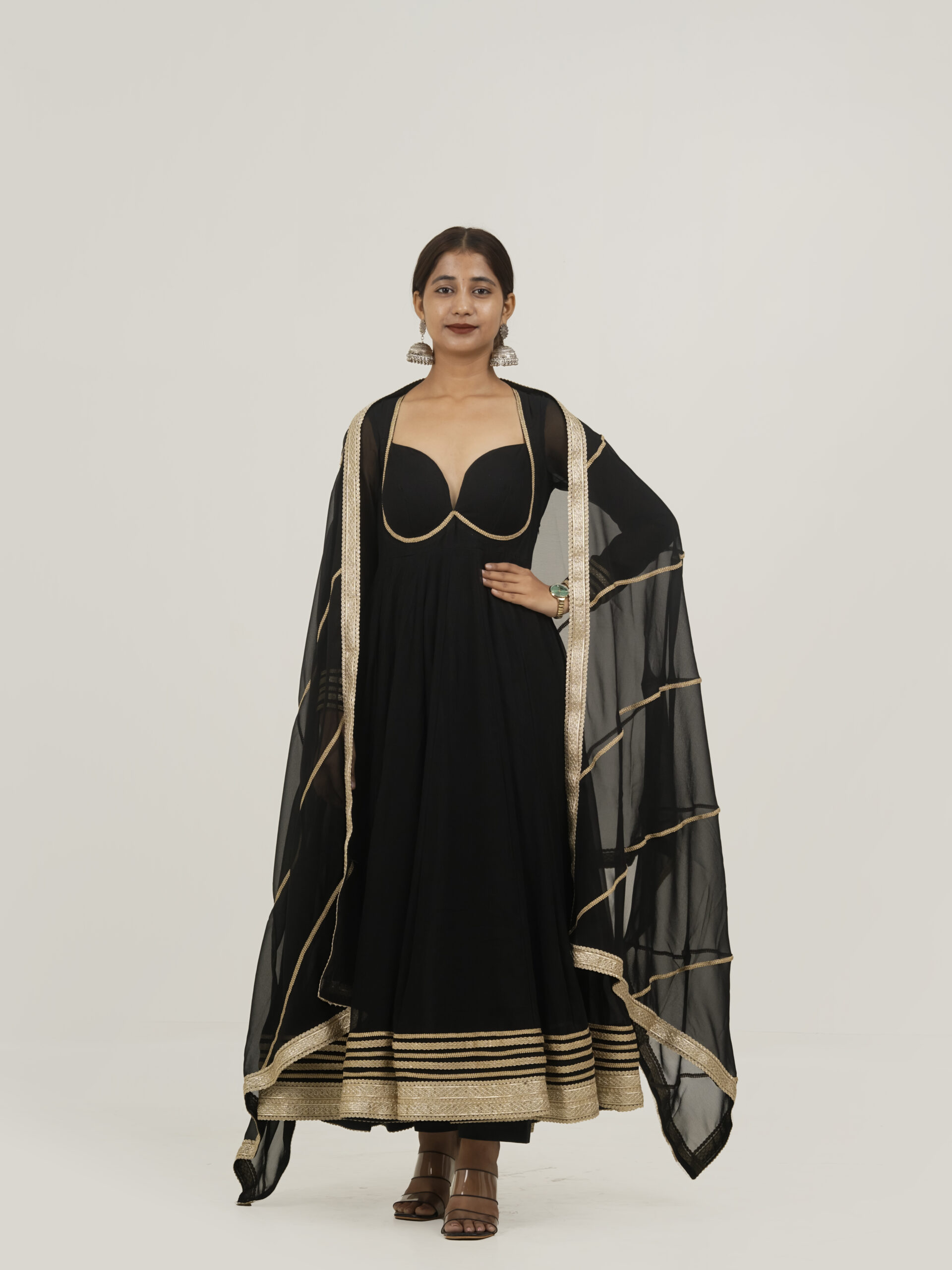 A regal black Anarkali set adorned with delicate lace work, blending elegance with timeless charm. The graceful flare and intricate lace detailing add a touch of sophistication, while the matching bottoms and dupatta complete the look. Perfect for evening celebrations and festive occasions.