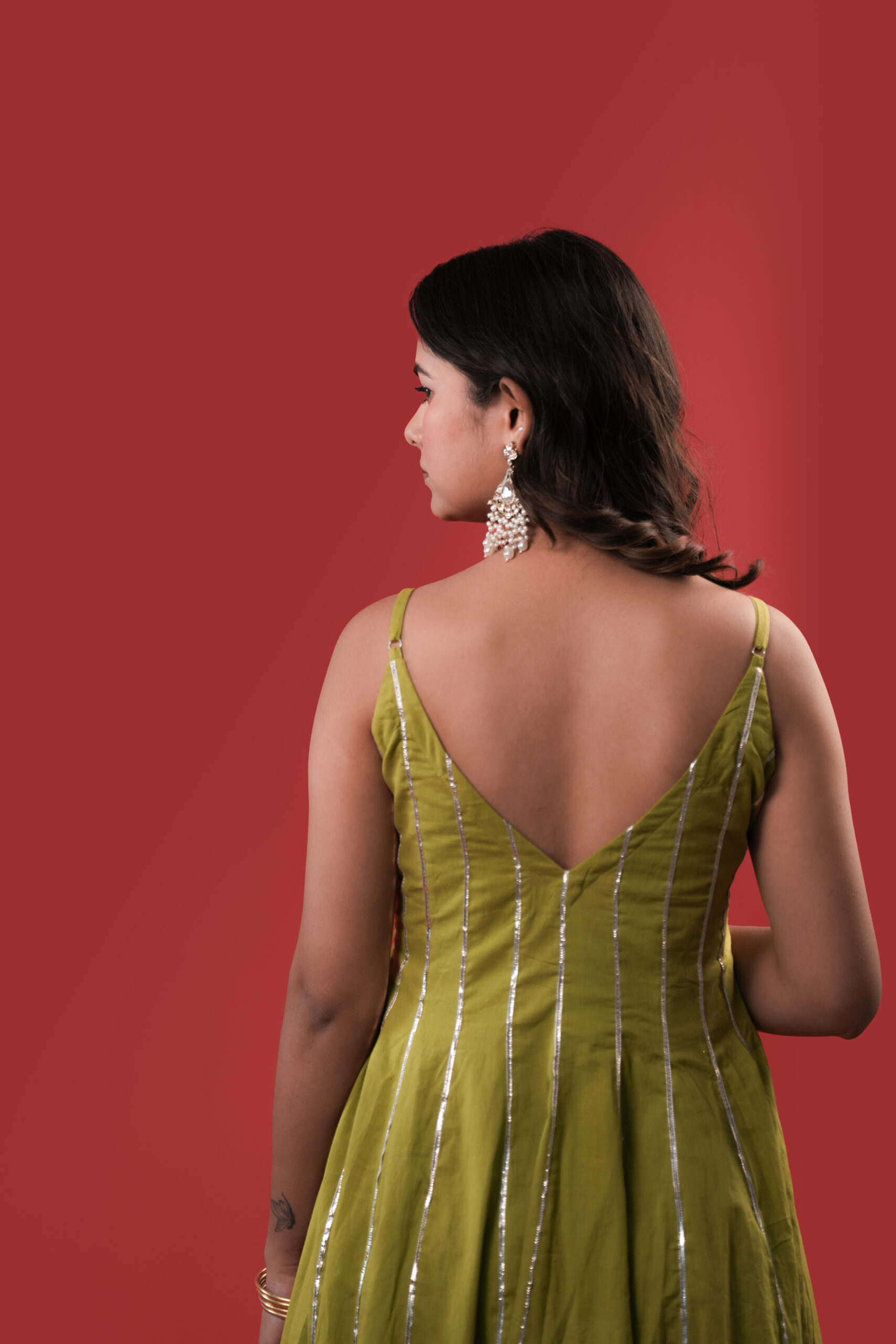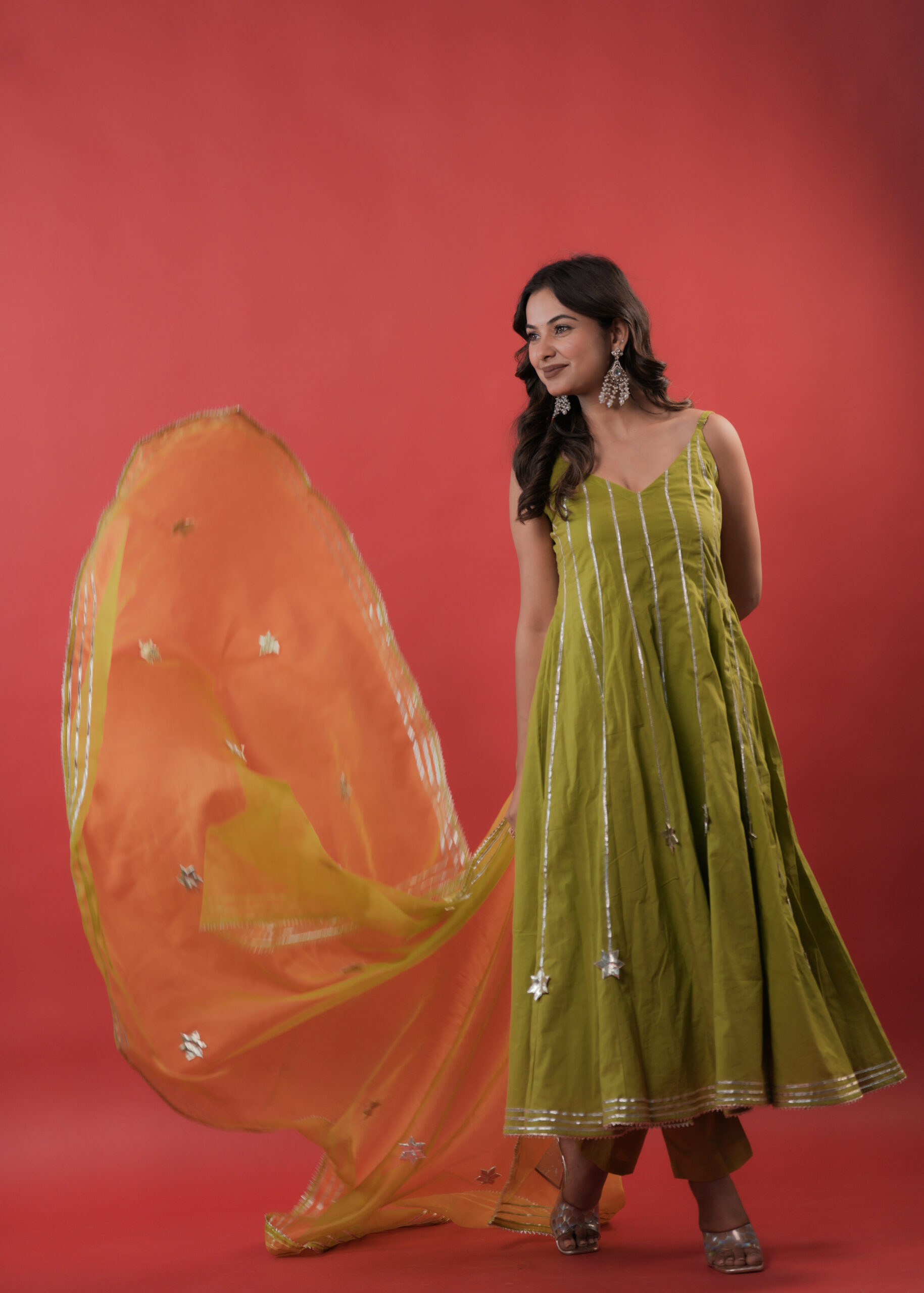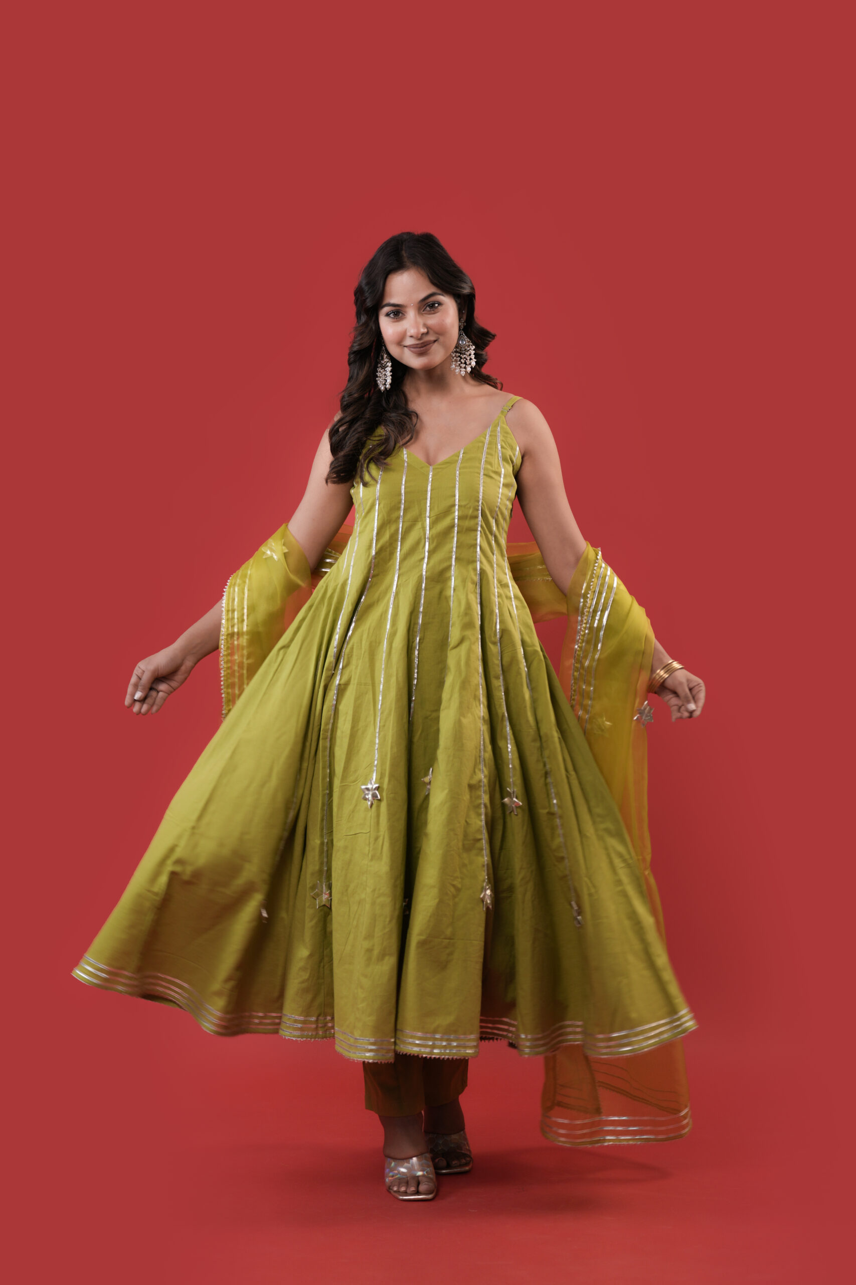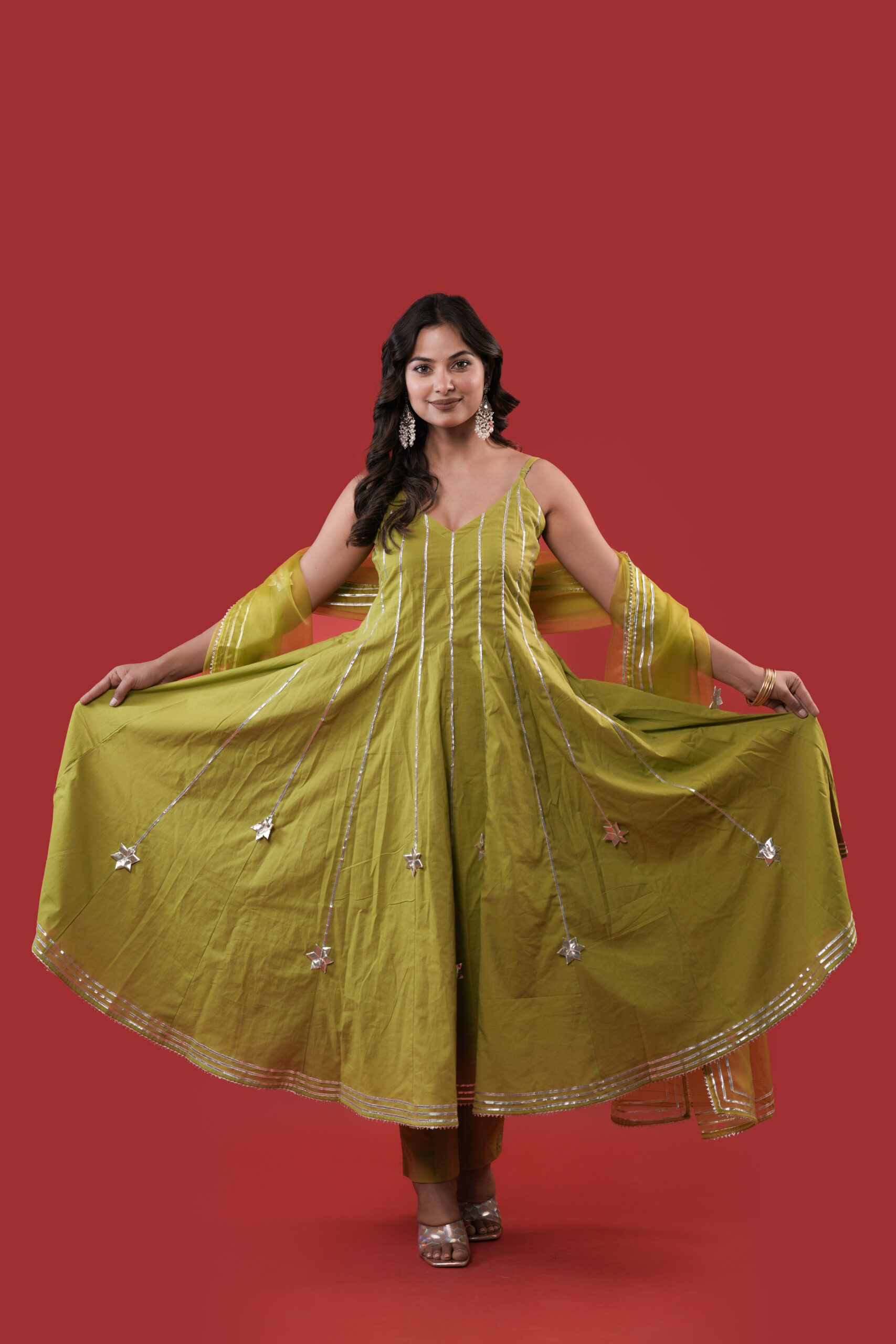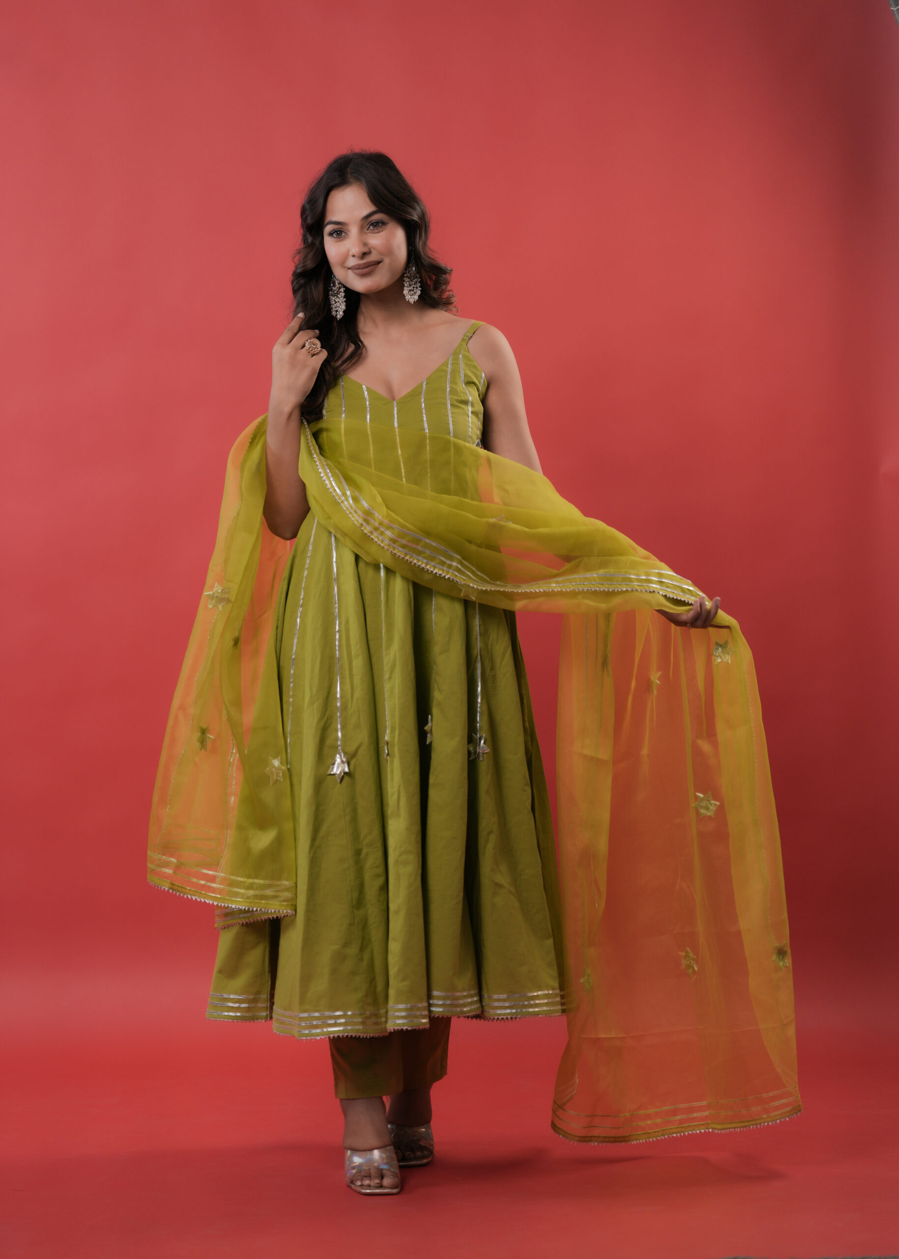 This starfall olive green Anarkali suit Set is thoughtfully crafted to offer a sophisticated blend of modern design and traditional detailing. The Anarkali features clean silver gota stripes and subtle star motifs, enhancing its graceful flow. Paired with a sheer matching dupatta adorned with silver star motifs and a neatly finished gota border, the ensemble presents a balanced and elegant look. Ideal for weddings, festive occasions, and formal celebrations, this outfit reflects understated luxury and timeless style.