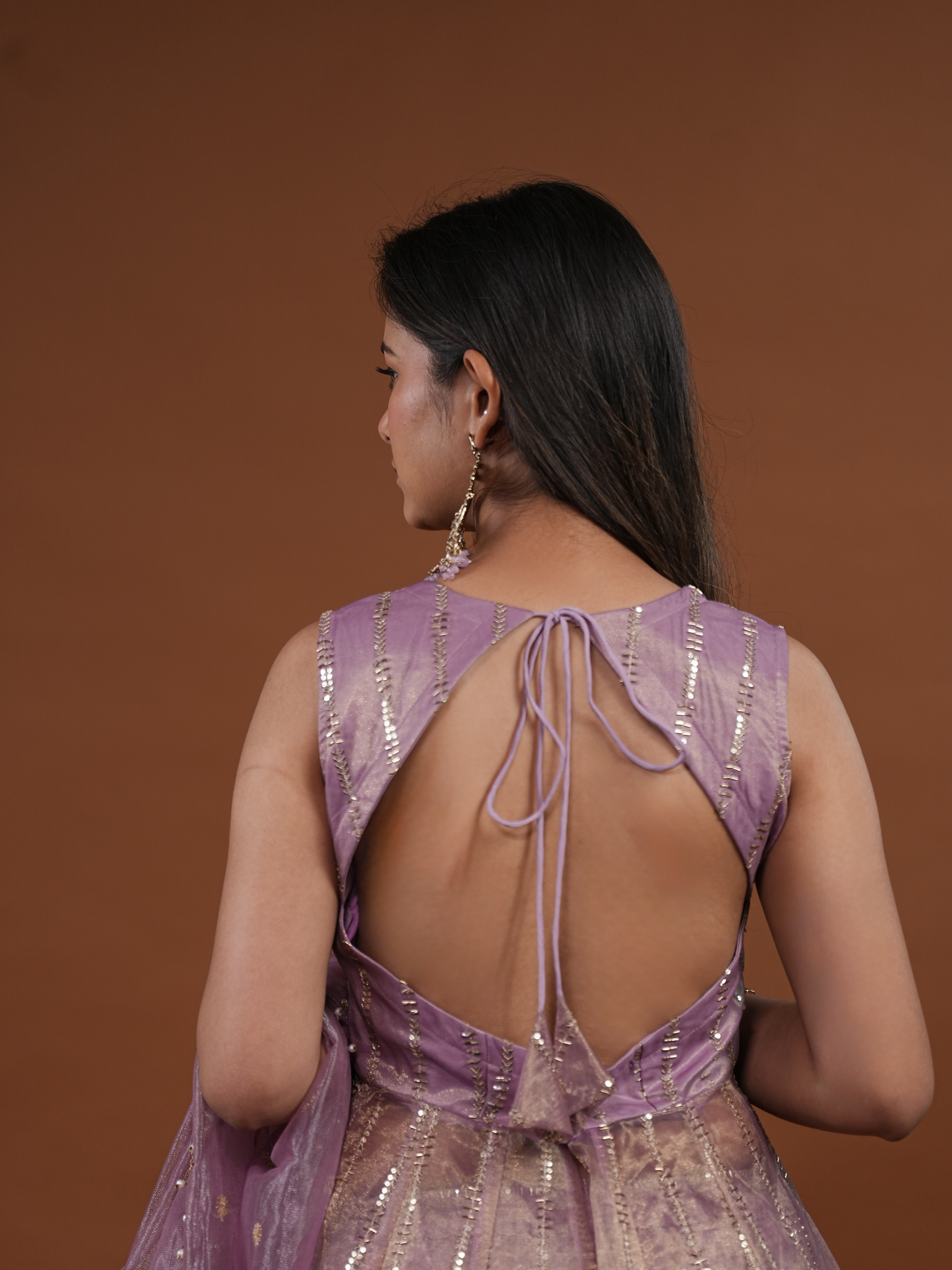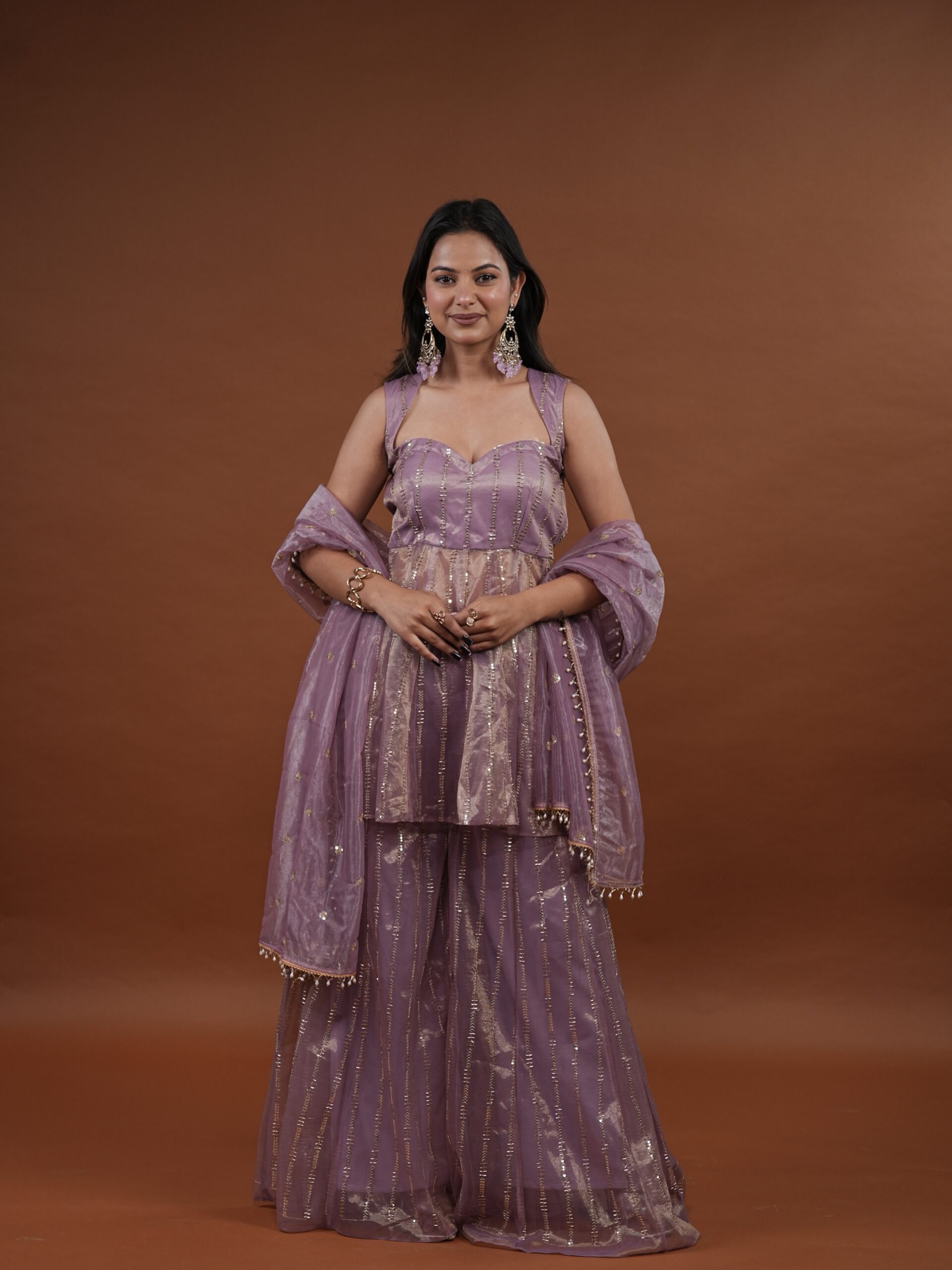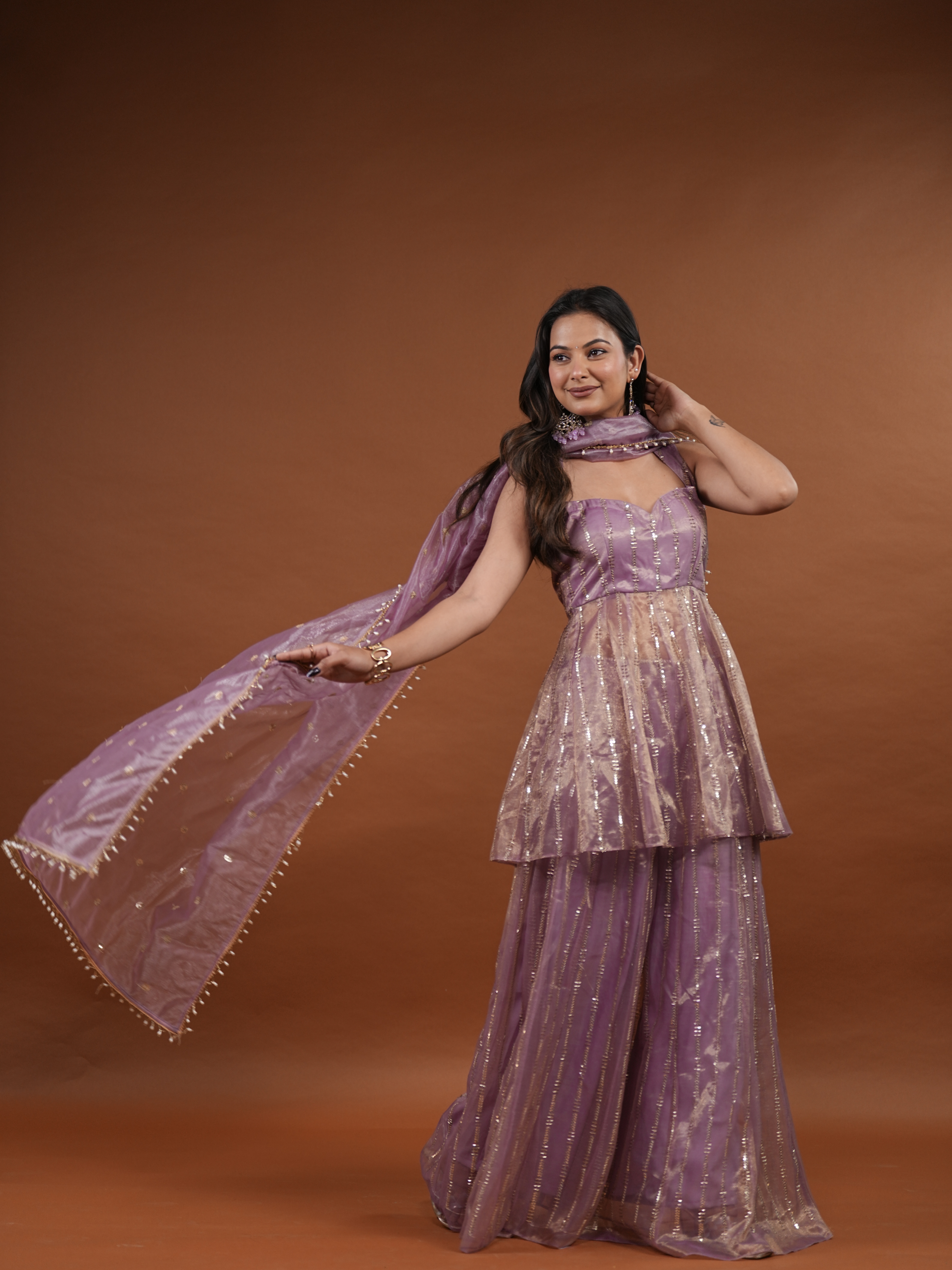 Designed for the modern muse, this lavender pink Indo-Western set features a structured bodice with a chic sweetheart neckline and sleek vertical sequin accents for a subtle glow. The relaxed flared pants add effortless movement, creating a bold yet refined silhouette.